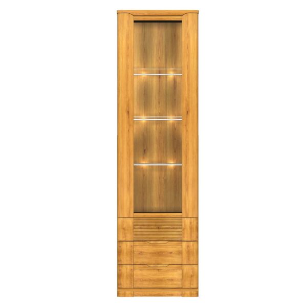 Высокий, узкий сервант с 3 выдвижными ящичками. Выполнен из высококачественного дерева. Передние панели ящичков на выбор – гладкие или рифленые. Двери и ящички с системой тихого закрывания «Silent». Освещение по желанию за дополнительную оплату.