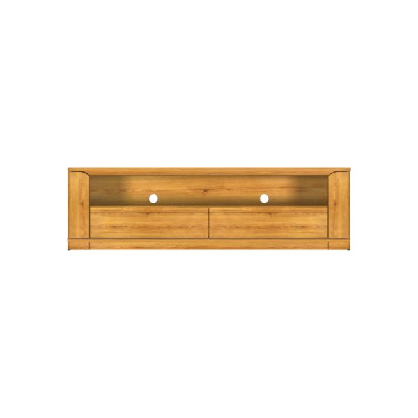 Деревянный комод под телевизор и оборудование RTV, с 2 выдвижными ящиками и двумя открытыми полочками для оборудования – отверстия в задней стенке делают возможной прокладку кабелей безопасным и эстетическим способом. Передние панели ящиков на выбор в гладкой или рифленой версии. Продукт доступен во многих цветовых вариантах.